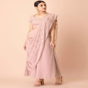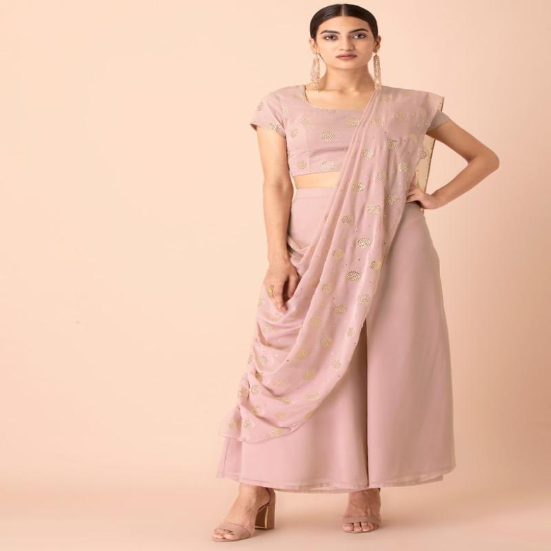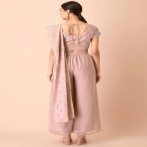 Saris get a functional and new-age spin with these fetching blush draped palazzo pants. Tailored in georgette and seasoned with a mukaish foil print, the pants are designed with an attached dupatta drape.