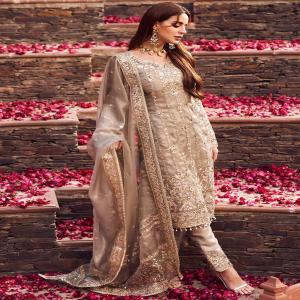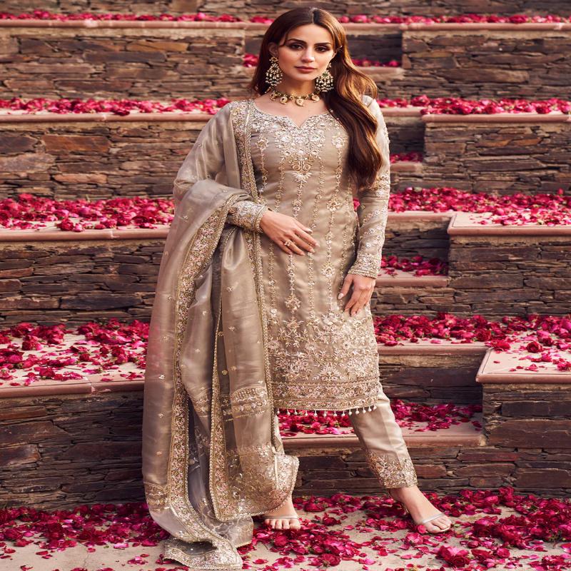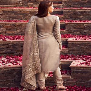 Our Dusty Grey Embroidered Straight Suit includes a net top with silk inner, silk bottom, and a net dupatta. Embroidery is present on this style using zari, sequins, and thread work.