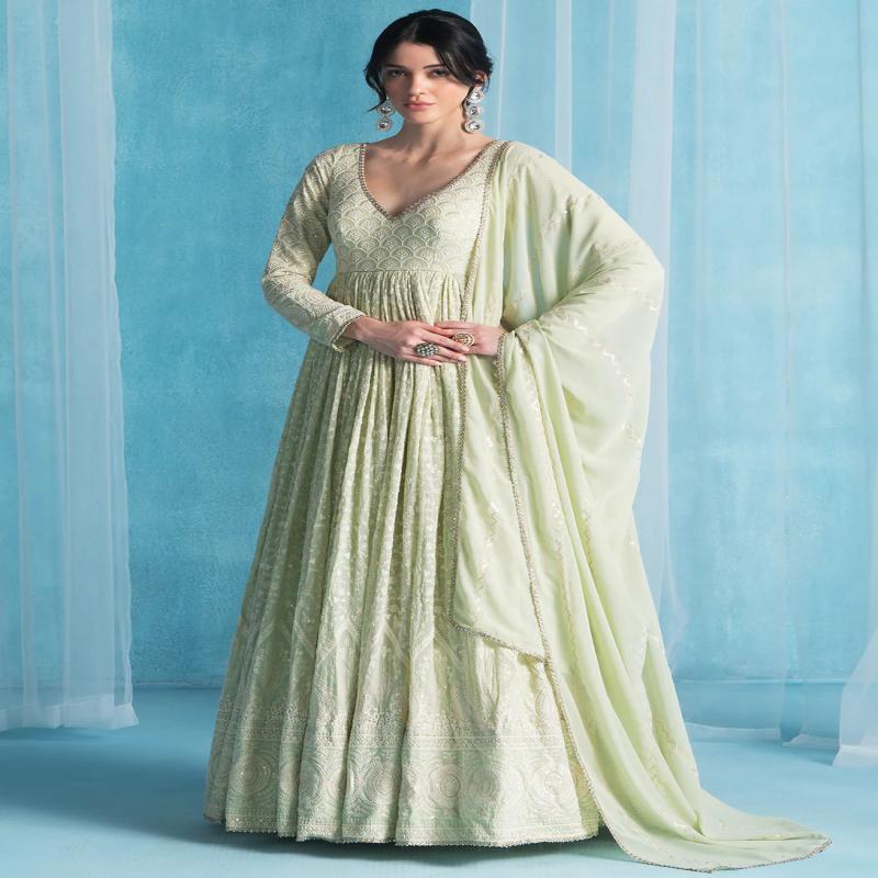 Our Mint Green Embroidered Lucknowi Anarkali includes a georgette top with santoon inner, georgette bottom, and a georgette dupatta. Embroidery is present on this style using sequins and stone work.