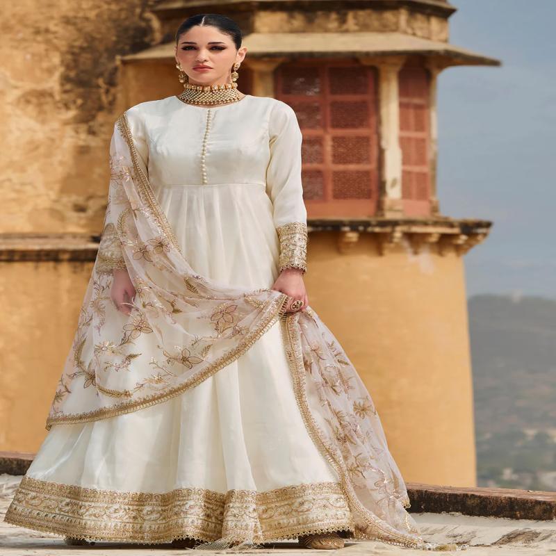 Our White Embroidered Organza Anarkali includes an organza top with satin inner, organza bottom with satin inner, and an organza dupatta. Embroidery is present on this style using zari, sequins, and thread work.